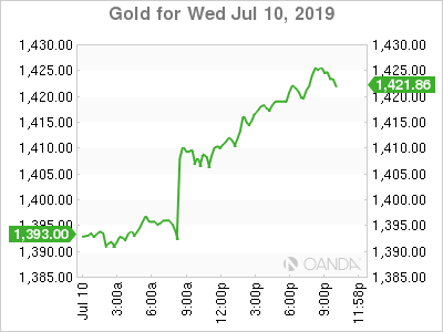 Gold jumped 1.46 percent on Wednesday after the Fed Chair continued to signal an upcoming rate cut. In his prepared remarks and later in the question and answer period Fed Chair Jerome Powell went full dove with his comments. The US-China trade war continues to be a threat for global growth and the US central bank is being forced to slash the benchmark interest rate to keep the economy from regressing.