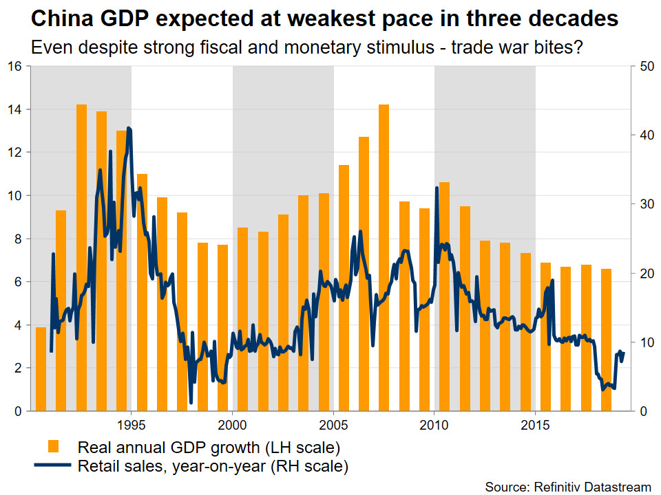 The world’s second-largest economy will release a raft of data on Monday, with the highlight being the GDP print for Q2. Economic growth is forecast to have slowed to 6.2% in yearly terms, from 6.4% earlier, which if confirmed would be the clearest sign yet that the trade war has really started to bite. The nation’s retail sales, fixed asset investment, and industrial production for June are all coming out as well.