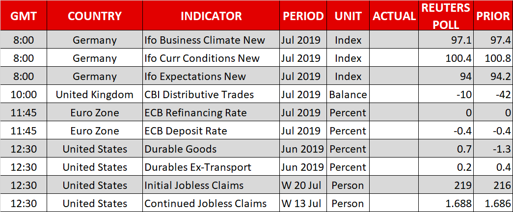But with the US manufacturing sector not being immune to the resulting downturn in global trade, the Federal Reserve is expected to press ahead with rate cuts in the coming months regardless of whether trade talks get fully back on track. IHS Markit’s manufacturing PMI for the US hit a 10-year low in July, putting even more focus on today’s durable goods orders due at 12:30 GMT and tomorrow’s preliminary GDP print for the second quarter for better clues about the health of the world’s largest economy.