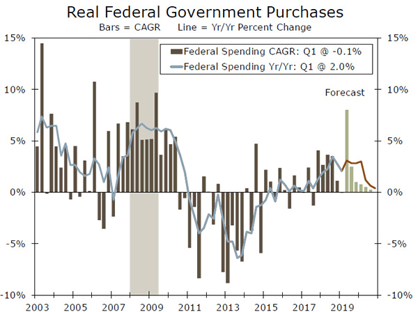 The budget agreement was roughly in-line with what we already had baked into our baseline forecast. Our forecast assumes that the previous FY-2018/FY-2019 boost to growth from more spending would gradually give way to inflation-adjusted federal consumption and investment converging towards zero over time (bottom chart). Put another way, our forecast assumes discretionary spending growth will continue over the next year or two, but at a slower pace than has been the case more recently.