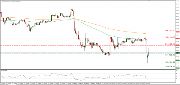 The USD tumbled against a number of its counterparts on Friday as the US-Sino trade war escalated further. The escalation started as China announced counter-tariffs on imports from the US yet the US President was quick to respond by telling US companies that they need an alternative to China and threatening with additional tariffs. It should be noted that early during today’s Asian session, the Chinese Vice President stated that China wants to a “calm” resolution of the dispute through negotiations, which could ease tensions somewhat, yet that remains to be seen. Please note that the event overshadowed a speech by Fed’s Chair Jerome Powell, in which no further stimulus was announced, yet he stated that the US economy is in a “favourable place” and that the Fed would “act as appropriate” to keep economic expansion on track. It should be noted that the US President tweeted that the Fed was doing nothing, after the speech. We expect volatility to continue and should tensions start easing a bit, we could see safe havens weaken. USD/JPY tumbled on Friday yet recovered some ground during today’s Asian session and currently is trading just above the 105.30 (S1) support line. Please note that the pair had scored a yearly low in today’s early Asian session. We could see the pair maintaining a sideways motion, yet should trade tensions ease somewhat, we could see the pair rising. Should the pair’s long positions be favoured by the market, we could see the pair breaking the 106.00 (R1) resistance and aim for higher grounds. Should the pair come under the market’s selling interest, we could see it breaking the 1105.30 (S1) support line and aim for the 104.65 (S2) support level.