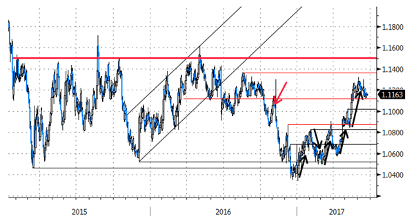 Early May, EUR/USD failed to break below the 1.0821/1.0778 support (gap). Poor US data and US political upheaval propelled EUR/USD north of the 1.1023 range top. The pair tested the 1.1300 area going into the FOMC decision, but the test was rejected. So the Trump top/correction top at 1.1300/1.1366 proved to be a solid resistance. USD sentiment will have to become really negative to clear this hurdle. EUR/USD 1.1110 is a first minor support (tested yesterday but no break). A return below 1.1023 would indicate that the upside momentum has eased.