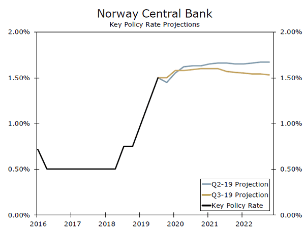 The central bank has been raising interest rates in an attempt to cool its economy, while has benefitted from generally buoyant oil prices and withstood the global slowdown and uncertainty surrounding global trade tensions and Brexit. However, the board’s current assessment of the Norwegian economy suggests that the policy rate will most likely remain at its current level over the forecast horizon. As of now, we share the same view as the board and believe the Norges Bank will be on hold for the foreseeable future.