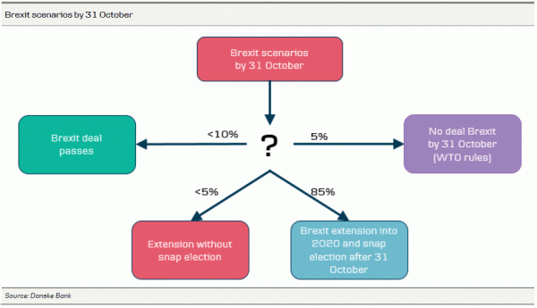 In our view, the likelihood of both the UK leaving with and without a deal is limited and our base case is another extension followed by snap election. The snap election may take us closer to the end game depending on the outcome. Unfortunately, due to the UK election system (‘winner takes all’ in each of 650 constituencies), it is very difficult to forecast the election result. We were caught by surprise both when David Cameron secured an absolute majority in 2015 and when Theresa May lost the absolute majority in 2017.