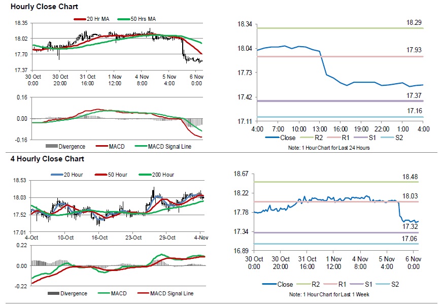The pair is expected to find support at 17.37, and a fall through could take it to the next support level of 17.16. The pair is expected to find its first resistance at 17.93, and a rise through could take it to the next resistance level of 18.29.