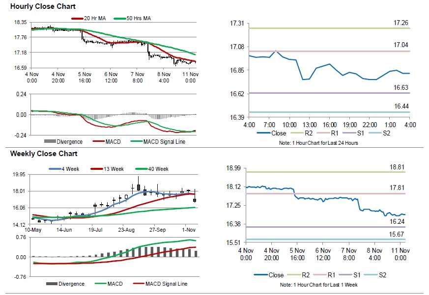 The pair is expected to find support at 16.63, and a fall through could take it to the next support level of 16.44. The pair is expected to find its first resistance at 17.04, and a rise through could take it to the next resistance level of 17.26.