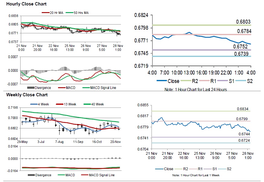 The pair is expected to find support at 0.6752, and a fall through could take it to the next support level of 0.6739. The pair is expected to find its first resistance at 0.6784, and a rise through could take it to the next resistance level of 0.6803.