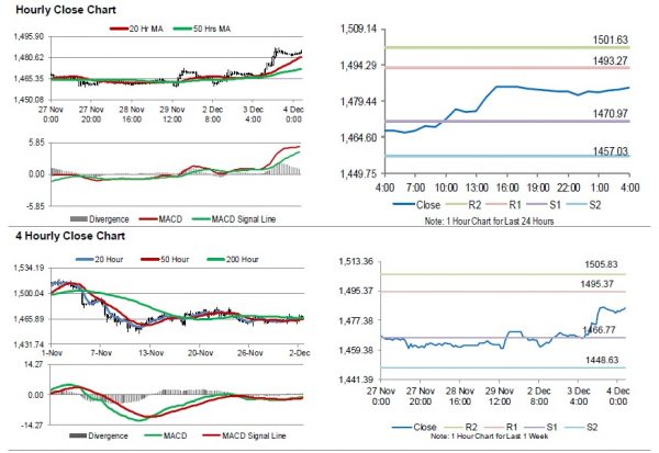 In the Asian session, at GMT0400, the pair is trading at 1484.90, with gold trading 0.09% higher against the USD from yesterday’s close.