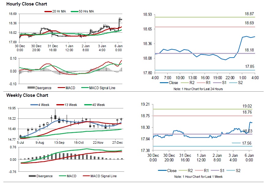 The pair is expected to find support at 18.18, and a fall through could take it to the next support level of 17.85. The pair is expected to find its first resistance at 18.69, and a rise through could take it to the next resistance level of 18.87.