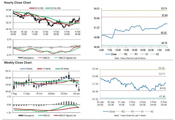 The pair is expected to find support at 50.32, and a fall through could take it to the next support level of 48.78. The pair is expected to find its first resistance at 52.80, and a rise through could take it to the next resistance level of 53.74.