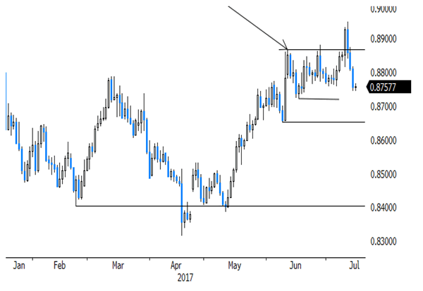 A combination of hawkish ECB comments and soft US data pushed EUR/USD above the 1.1300/66 resistance area end June. The payrolls were not good enough to trigger a sustained USD rebound. Next resistance in the 1.15 area is looming. LT-correction tops stand at 1.1616/1.1714. A break would end the long consolidation period that followed the sharp decline of EUR/USD in 2014/early 2015. Such a key area will be difficult to break for now. A return below the 1.13 area would be a first indication of a loss in upside momentum. EUR/USD 1.1119/10 is the next important support.