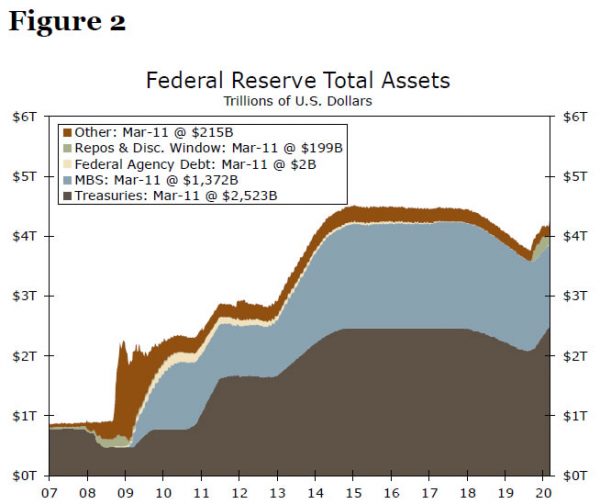 The Primary Dealer Credit Facility (PDCF) is another program that the Fed created during the financial crisis and brought back to life on March 17. Primary dealers can pledge a wide range of securities as collateral in return for borrowing at low interest rates from the Fed.1 The purpose of the PDCF is “to support the credit needs of American households and businesses,” and it serves as a de facto discount window for the primary dealers. It will exist for at least the next six months. The resurrection of the CPFF and the PDCF are strong indications that the Fed’s emergency lending powers remain robust.