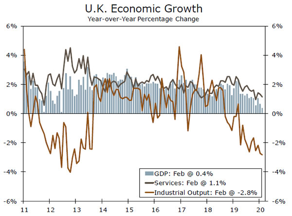 U.K. February GDP data showed activity stuttering even ahead of the most significant impacts of the COVID-19 virus on the economy, as February GDP fell 0.1% month-over-month. To be sure much of the weakness was concentrated in construction activity, which fell 1.7%. Industrial output rose 0.1% and for the service sector—which accounts for some 80% of the overall economy—activity was flat for the month. Compared to February last year, U.K. GDP rose just 0.4%, the smallest annual increase since mid-2012.