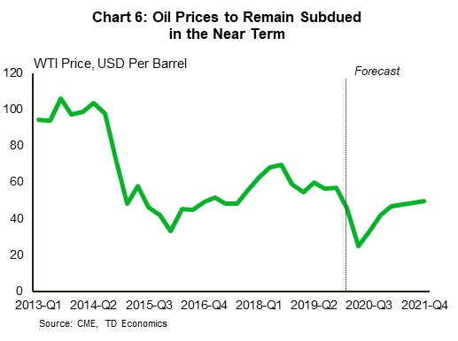 We lower our Q2 (quarterly average) price estimate for WTI to US$25 (from US$27) to account for already-weak tracking in April, slumping consumption in the U.S., and mounting global storage capacity concerns. After all, these cuts will only start in May – at which point inventories would have hit record levels. However, we also revise upwards our price profile for the Q4 to US$42, and more notably, for 2021, to an average of around US$49 for the year (See chart 6). Justifying this increase in the latter part of the horizon is the magnitude and the duration of the recent OPEC+ cuts – a portion of which is intended to last until early 2022. If the agreement is maintained, global inventories are likely to return to their pre-COVID levels by early next year after surging this quarter. Of course, this rests on a critical assumption that demand starts to normalize by May.
