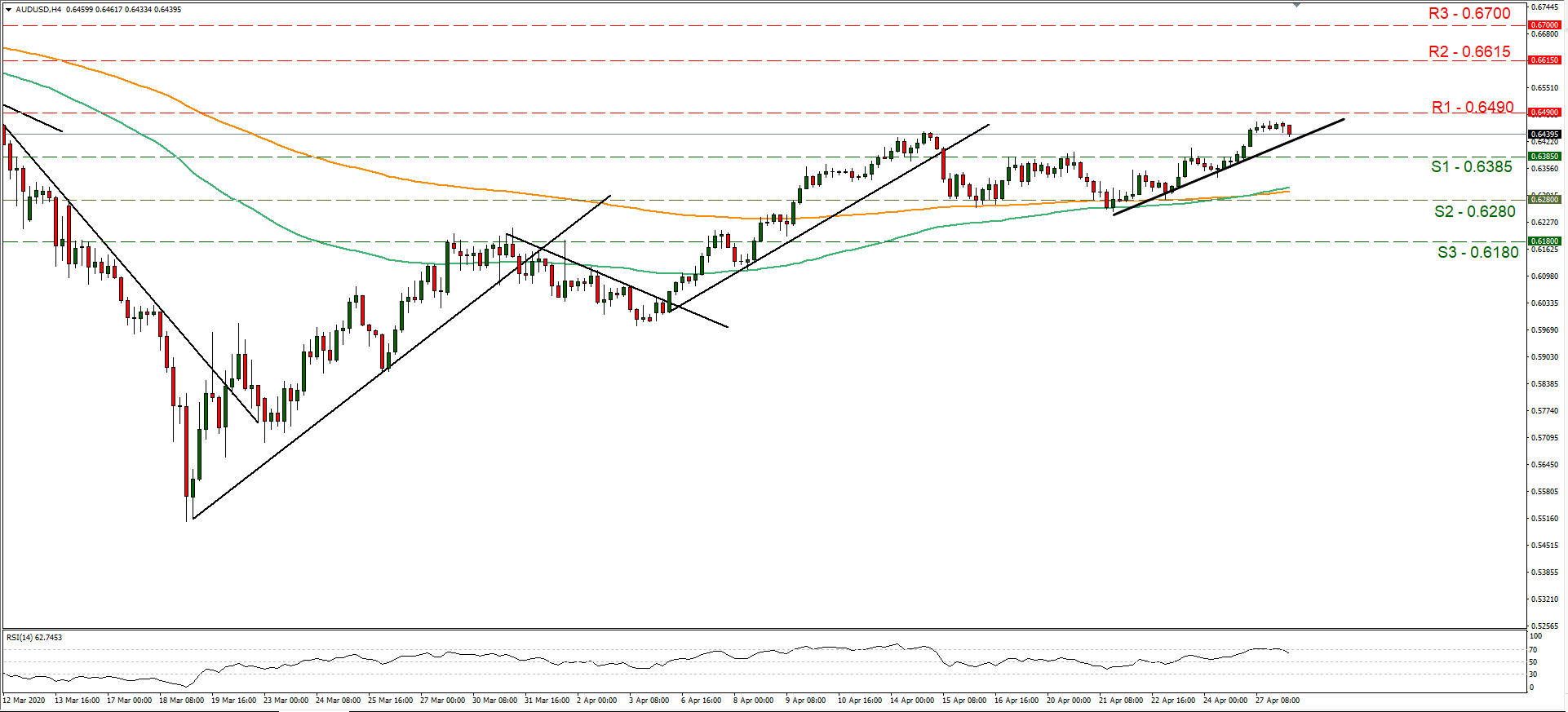 The Australian currency strengthened against the USD yesterday, reaching the highest point since mid-March before correcting lower in today’s Asian session. The market’s confidence may have gotten another lift as lockdown measures tend to ease in various parts of the world in an effort to restart economies, world-wide. Analysts noted that reopening plans have fed a positive market sentiment to start the week, while at the same time may exercise some pressure on the greenback, also due to its safe-haven qualities. It should be noted that Australia seems to have been spared from the high number of deaths marked in other countries and in various parts of the country restrictions are easing. It was characteristic that in Australia home visits are to be allowed, while beaches are to be reopened. We expect that should the risk appetite continue to improve, the AUD may rise further, while Aussie trader’s attention is expected to be turned towards the CPI rates for Q1 which are to be released during tomorrow’s Asian session. AUD/USD rose slightly yesterday nearing the 0.6490 (R1) resistance line, yet during the Asian session relented some ground. We maintain a bullish outlook for the pair as long as it remains above the upward trendline incepted since the 21st of the month. Should the bulls maintain control over the pair’s direction we could see it breaking the 0.6490 (R1) line and aim for the 0.6615 (R2) hurdle. If the bears take over, we could see the pair breaking the 0.6385 (S1) support line and aim for the 0.6280 (S2) support barrier, which contained the pair’s drop on the 16th and 21st of the month.