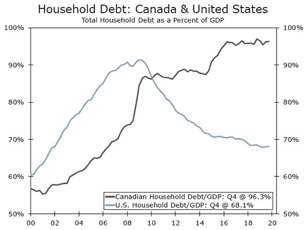 But also like the RBA, Canada’s economy continues to suffer from the double hit from measures adopted to fight COVID-19 and low commodity prices. After a 2.0 million decline in payrolls in April, the Canadian labor market saw an employment gain of 290,000 in May, according to data released this morning. Like the United States, the Canadian government has passed measures to support households that have lost income or stopped working due to COVID-19. Workers can receive a taxable benefit of $2,000 every four weeks for up to 16 weeks. But household debt levels are on average much higher in Canada than the United States, and a prolonged period of labor market weakness could lead to major challenges for the Canadian economy down the road.