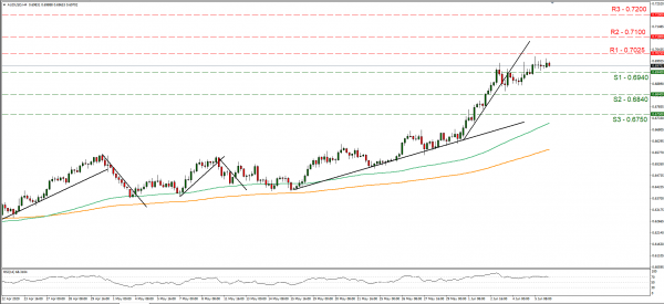 The USD weakened against a number of its counterparts despite surprisingly improved US labour data for May, released on Friday. The unemployment rate dropped instead of rising as expected, while the NFP figure was in the positives with +2.5 million startling the markets. Analysts tend to note that the USD’s gains at the release may have been capped as the figures increased expectations for a recovery in the US economy, thus creating safe haven outflows for the greenback. It was characteristic that the USD weakened against the Aussie and the pound yet tended to strengthen against the JPY and the CHF. The markets seem to continue to be focused on signs of an early recovery, despite the ongoing unrest and protests in the US. Despite a number of financial releases expected, traders seem to be eyeing the Fed’s interest rate decision on Wednesday for more clues about a possible US recovery. AUD/USD maintained a sideways motion with little gains, remaining between the 0.6940 (S1) support line and the 0.7025 (R1) resistance line. We maintain our bias for a sideways motion albeit the bulls may be just around the corner. Should the pair find fresh buying orders along its path, we could see it breaking the 0.7025 (R1) resistance line and aim for the 0.7100 (R1) resistance level. In a selling momentum, we could see the pair breaking the 0.6940 (S1) support line and aim for the 0.6840 (S2) support level.
