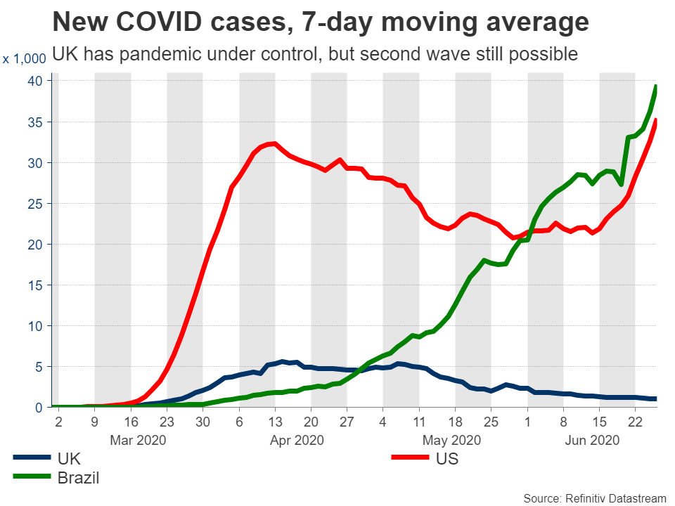 That’s a story for another time, though. For now, the pound’s path will likely be decided by how the upcoming Brexit talks play out, and whether the resurgence of infections globally continues. On the virus front, cases are surging in the United States and that has crippled risk appetite in recent days, by extension weighing on sterling.