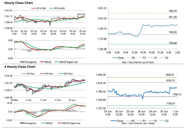 The pair is expected to find support at 1782.00, and a fall through could take it to the next support level of 1763.80. The pair is expected to find its first resistance at 1811.20, and a rise through could take it to the next resistance level of 1822.20.