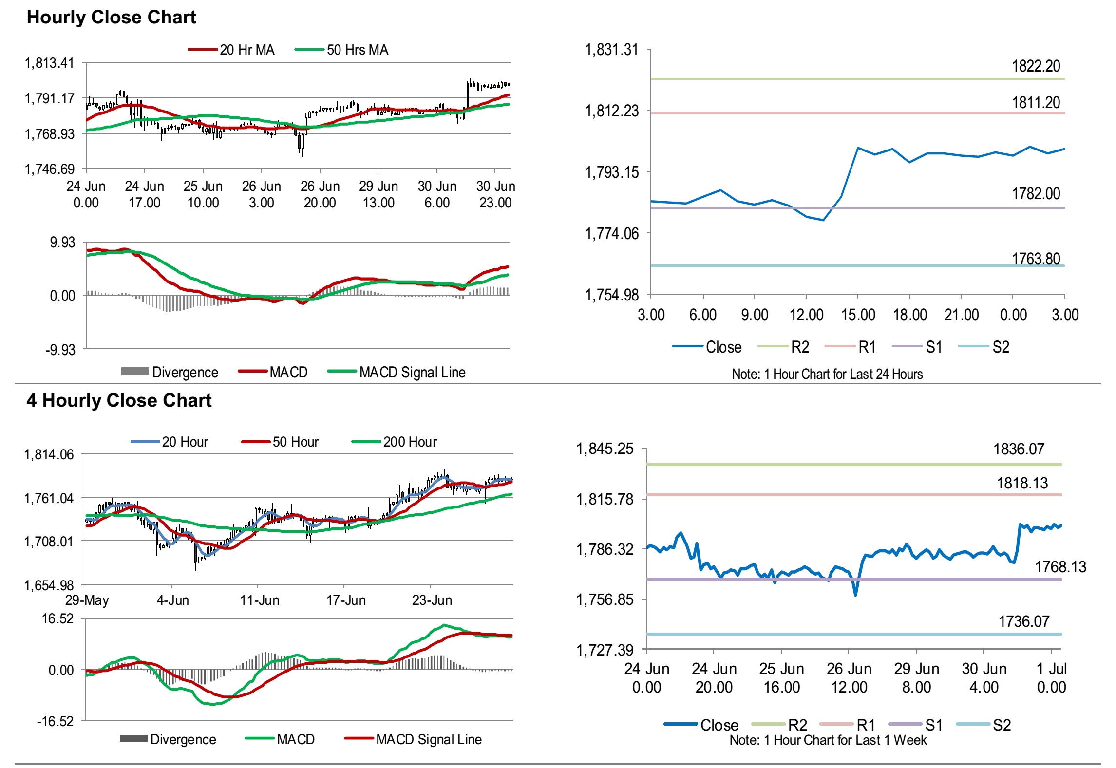 In the Asian session, at GMT0300, the pair is trading at 1800.20, with gold trading 0.14% higher against the USD from yesterday’s close.