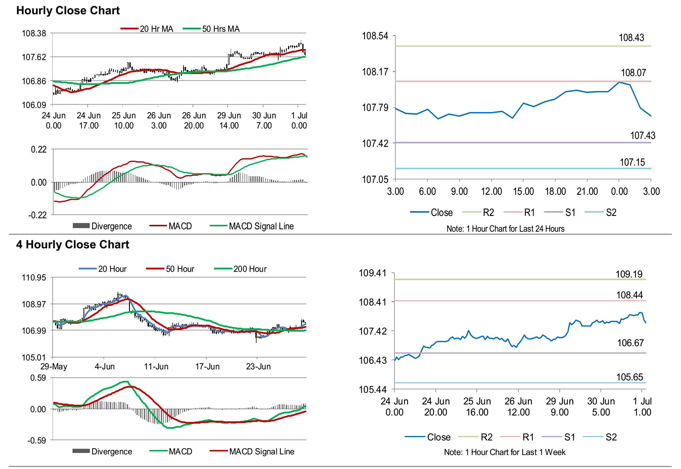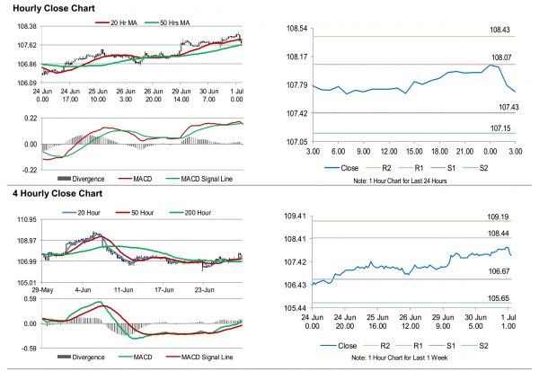 In the Asian session, at GMT0300, the pair is trading at 107.70, with the USD trading 0.24% lower against the JPY from yesterday’s close.