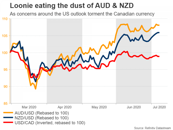 Indeed, much of the loonie’s underperformance likely comes down to concerns around the US economy. Roughly three-quarters of all Canadian exports are destined for the US market, so the loonie’s fortunes are inexorably tied to the American economy, which is currently struggling with a resurgence in virus cases that might derail the recovery.
