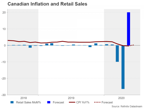 Retail sales in Canada tumbled by 26.4% m/m in April, which was the largest downturn on record due to the Covid-19 pandemic and is expected to have rebounded to 20% m/m in May. Core sales are predicted to increase by 12% m/m versus a decline of 22% m/m previously. The falls were mainly led by the significant drop at motor vehicle and parts dealers, clothing and clothing accessories stores and gasoline stations, as crude oil prices collapsed due to a global oil supply glut and lower demand.