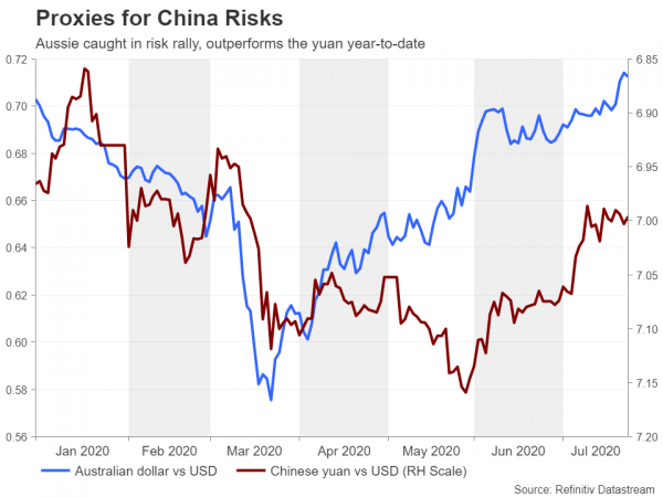 As US politicians squabble over the next fiscal stimulus bill and the country’s virus death toll ticks up again, markets may lean on the Federal Reserve next week for a quick fix. The Federal Open Market Committee (FOMC) meeting will undoubtedly be the most eagerly awaited event of the week. But second quarter GDP prints out of the United States and the euro area will not be far behind as the full extent of the economic shock from COVID-19 is laid bare. In the meantime, as tensions between the US and China continue to simmer, how much longer will traders be able to brush this risk under the carpet?Fed may not ease virus and stimulus jitters
