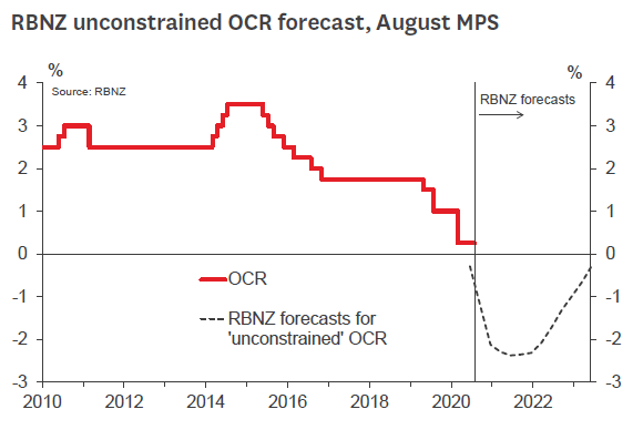 Like us, the RBNZ has not really changed its overall assessment of the economic and inflation outlook. The RBNZ’s “unconstrained OCR forecast,” which gives a sense of the overall degree of monetary stimulus that is required, has not changed relative to the May MPS, and is still sitting at -2% for two years. Like us, the RBNZ has acknowledged the surprising resilience of the economy to date. But like us, the RBNZ is concerned about the longer-term outlook due to health uncertainty, the likelihood that the borders will be closed for longer than previously thought, and the weak global economy. Consequently, the RBNZ has not really altered its longer-term GDP forecast (again, similar to us). The RBNZ is also concerned that medium-term inflation will be supressed by a recent increase in the exchange rate and possibly a fall in inflation expectations
