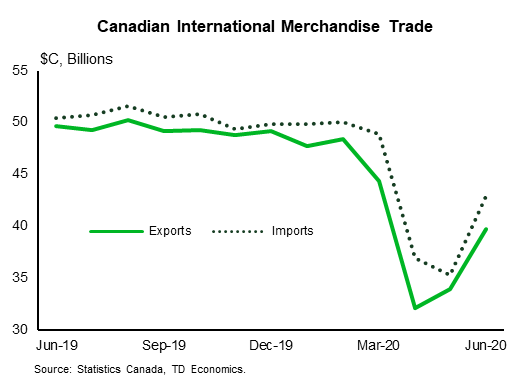 TD looks for the international goods trade deficit to narrow to $2.0bn in July, helped by another sizeable increase in motor vehicle exports. Auto production (nsa) returned to pre-COVID levels in June and held roughly stable through the next month, despite seasonal headwinds that have seen July production fall by 35% on average over the last 5 years. Forestry products should provide another source of strength while stable PADD II imports suggest little change in real energy exports. Export strength will be partially offset by a more moderate rise for imports following the 22% surge last month.