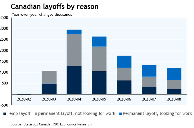 To be clear, labour markets are still very weak. Employment is still down more than a million from February, even after the August gain. The unemployment rate fell to 10.2% but that is still above the peak rate during the 2008/09 recession. The number of those on layoff is still exceptionally elevated. Temporary layoffs have eased more quickly (as expected) as the economy reopened, but a larger share of those still off-work are on permanent layoff, and it could take longer for those to be re-connected to jobs. A smaller share of job losses have been retraced in hard-hit industries like accommodation & food services and entertainment. But conditions continue to improve, even if at a more gradual pace.