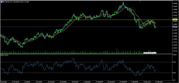 The EUR/USD pair declined to an intraday low of 1.1736, which is along the important support shown in yellow. The price attempted to bounce back and is now trading at 1.1770. On the four-hour chart, the price is below the 25-day and 50-day exponential moving averages. The RSI is slightly above the overbought level of 30 while the DeMarker indicator has moved below the oversold level. Therefore, a move below the support at 1.1736 will be a victory for the bears, who will push the price lower.