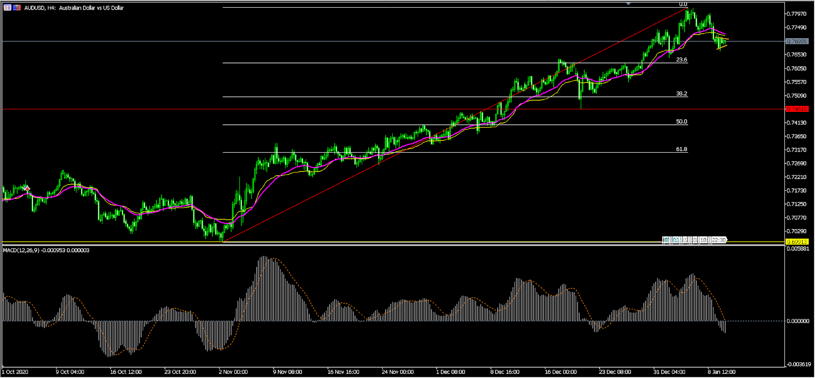 The AUD/USD pair dropped to an intraday low of 0.7665, which is the lowest it has been since Friday. On the hourly chart, this price is below the 25-day and 15- day exponential moving averages. It has also formed a bearish pennant pattern that’s shown in orange. Also, the price is slightly above the 23.6% Fibonacci retracement level while the MACD line and the histogram is below the neutral level. Therefore, the pair will likely continue falling as traders target the next support at 0.7600.