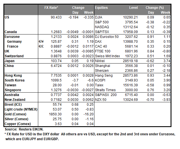 The common currency slipped against the USD, GBP and JPY yesterday as fundamentals concerning the path of the pandemic in Europe seem alarming. It’s reported by Bloomberg that France expanded a daily 12-hour curfew nationwide starting Saturday and German Chancellor Angela Merkel is promoting a tougher lockdown, given also the concerns that a more-contagious coronavirus variant could lead the infections out of control. According to German media, the tightening of the lockdown measures could include curfews and the closing of schools and in general, the spreading of the pandemic could delay Eurozone’s economic recovery and dampen its outlook. We expect that should considerations for intensified lockdown prevail among European leaders over the next two days EUR could weaken.