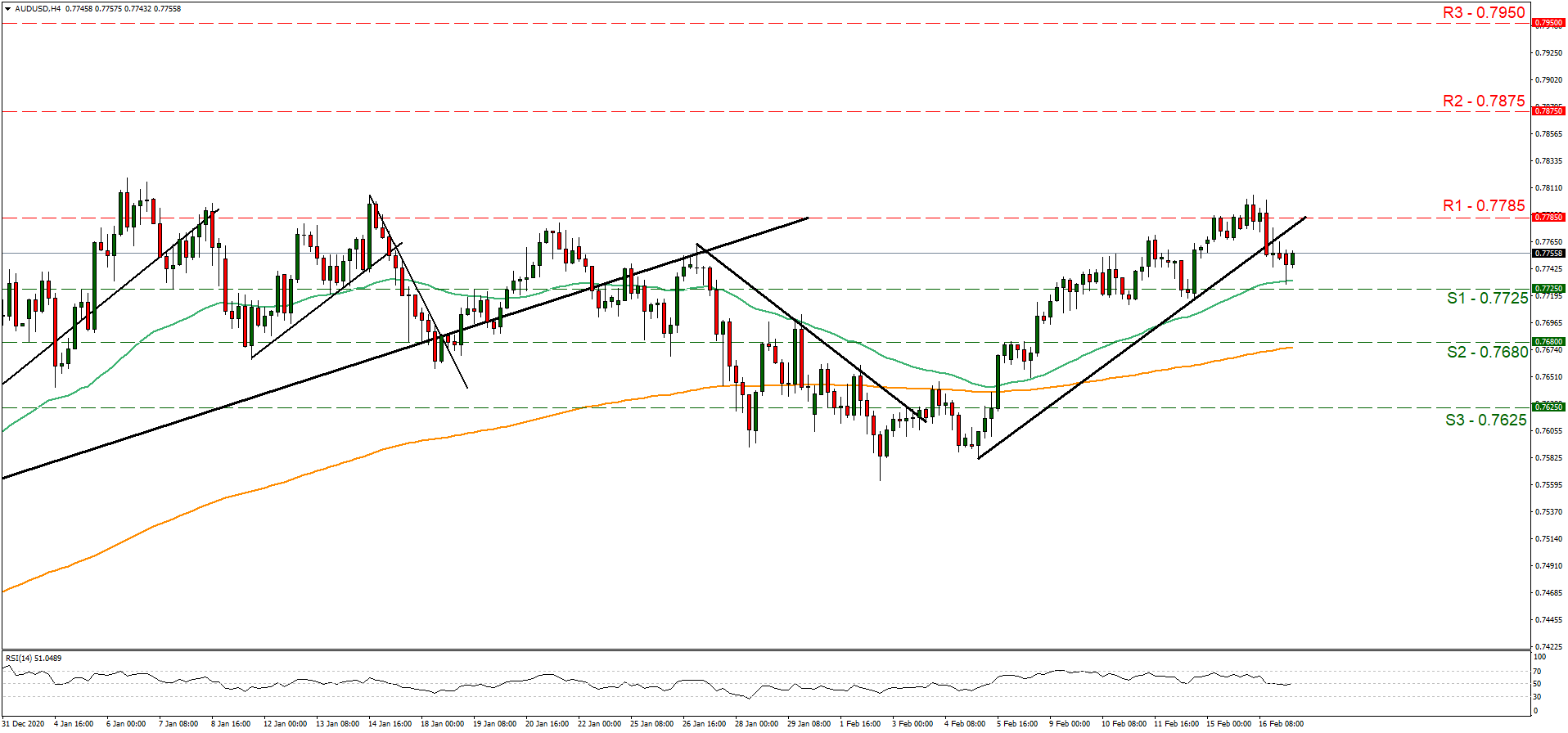 AUD/USD dropped yesterday aiming for the 0.7725 (S1) support line. As the drop of the pair’s price action broke the upward trendline incepted since the 5th of February, we switch our bullish outlook in favour of a sideways movement initially, albeit the bears may be just around the corner, should USD continue to strengthen. Also note that the RSI indicator below our 4-hour chart is at the reading of 50, implying a rather indecisive market. Should the bears dominate, we may see the pair breaking the 0.7725 (S1) support line, which reversed the pair’s downward movement on the 12th of February and aim for the 0.7680 (S2) support hurdle. Should the bulls be in charge of the pair’s direction, we may see AUD/USD breaking the 0.7785 (R1) resistance line and aim for the 0.7875 (R2) resistance level.