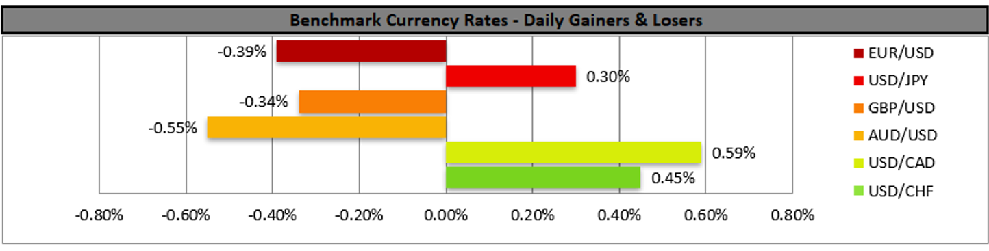 USD escaped from the boundaries of its sideways motion of the past few days gaining ground against a number of its counterparts yesterday. The US treasury yields were on the rise also puling with them the greenback higher, while analysts tend to note that the yields may have been driven higher by market concerns for inflation. Also, it should be noted that manufacturing data for the wider New York Area provided an upbeat picture for economic activity picking up pace. On the monetary front, St. Luis Fed President Bullard stated that financial conditions are generally good, which boosted optimism, while San Francisco Fed President Daly said that pressures on inflation are still downwards and implying that the Fed is to maintain low rates. We expect focus today to be on the release of the Fed’s last meeting minutes, while also financial releases could affect the markets.