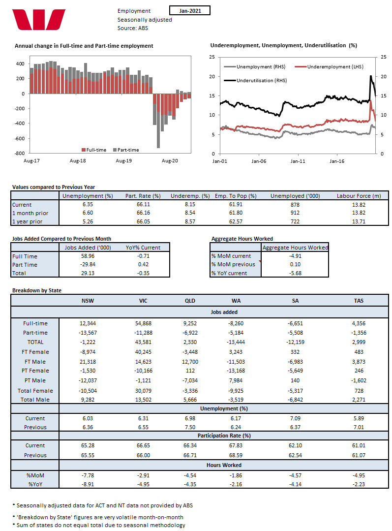 January 2021 Labour Force: Total employment: 29.1k from 50k (unrevised from 50k). Unemployment rate: 6.4% from 6.6% (unrevised 6.6%). Participation rate: 66.1% from 66.2% (unrevised 66.2%).