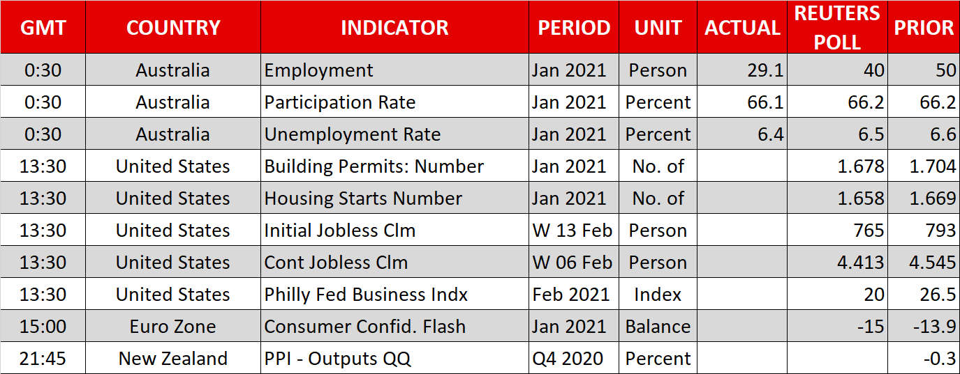 While stocks seem to be lacking direction, the US dollar is resisting the slide in Treasury yields, having surged yesterday on the back of stronger-than-expected data out of the US. Retail sales shot higher in January, as Americans started to receive their $600 stimulus checks. The retail control group measure of retail sales, which is used in calculating GDP, jumped by an impressive 6.0% m/m in January. Producer prices and industrial production also rose more than forecast.