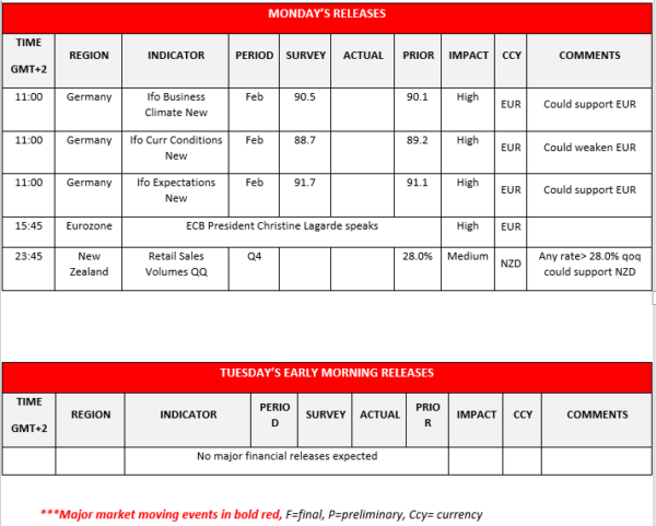 Today during the European session, we highlight Germany’s Ifo indicators for February, while later on, ECB President Christine Lagarde is scheduled to speak and could generate some interest among EUR traders. Also, just before Tuesday’s Asian session starts, we get New Zealand’s retail sales growth rate for Q4.