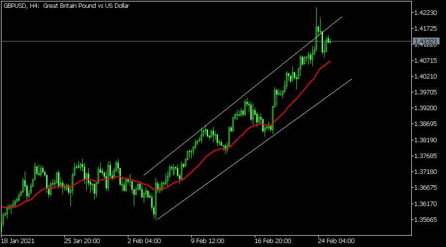 The GBP/USD price pulled back after soaring to a multi-year high. It is trading at 1.4135, which is slightly below the year-to-date high of 1.4240. On the four-hour chart, the price remains above the short and longer-term simple moving averages (SMA). The pair will likely resume the uptrend as bulls attempt to move above the YTD high.