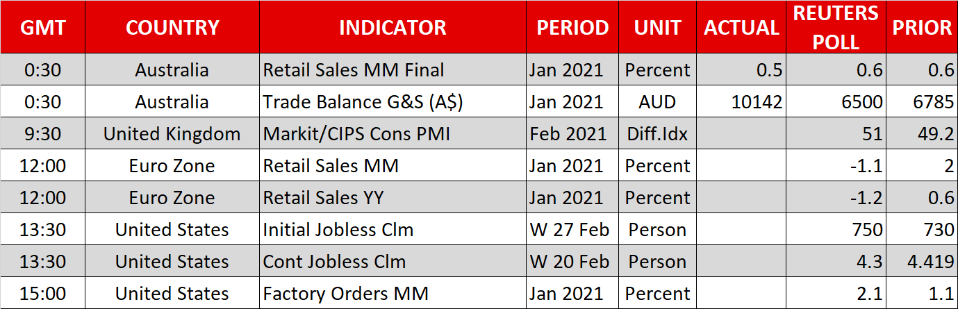 As Chair Jerome Powell prepares to deliver his final remarks before the Fed’s blackout period begins ahead of the March 16-17 policy meeting, speculation is growing that he will use today’s event to signal some action in the bond market. Powell is due to speak at an online Wall Street Journal jobs summit at 17:05 GMT and although it’s not very probable that he will announce a policy shift, he could sound more concerned about the spike in yields than he did in his last appearance.
