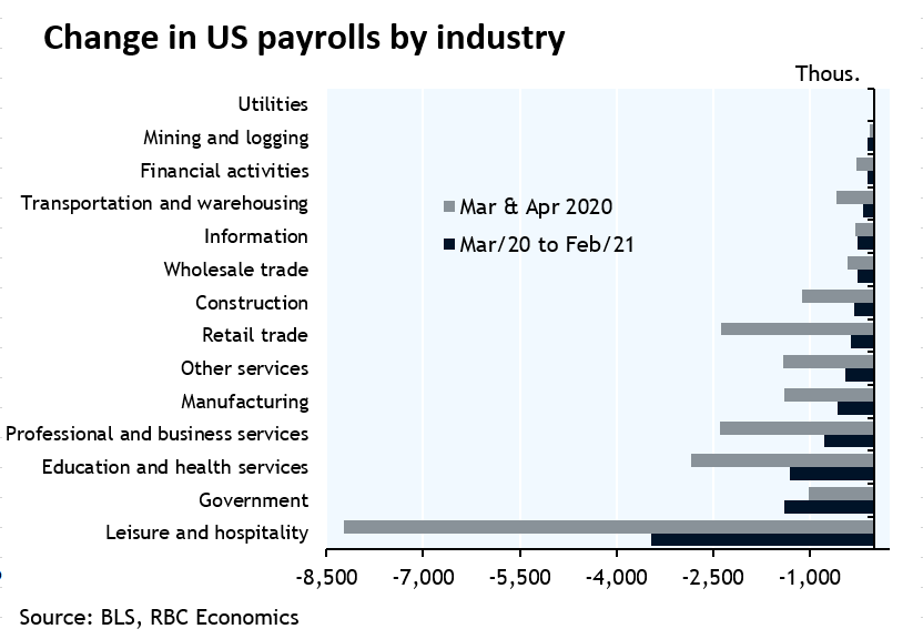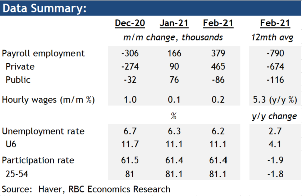 Payroll employment added 379k jobs in February, as restrictions were relaxed nation-wide amid lower number of COVID cases and accelerating vaccine distribution. The gain was broadly-based among private sector industries, led by a 355k increase in leisure and hospitality – although these industries still accounted for the largest shortfall of jobs relative to pre-shock levels (over a third of the remaining 9.5 million total). Mining and construction both shed jobs, likely impacted by severe weather in parts of the country.