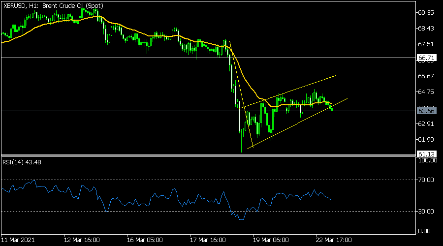 The XBR/USD pair declined to a low of 63.71, erasing some of the gains made yesterday. On the hourly chart, the pair has moved below the lower line of the bearish flag pattern that is shown in yellow. It has also moved slightly below the 15-day and 25-day moving averages while oscillators like the Relative Strength Index (RSI) and MACD have started to decline. The pair may keep falling as bears target the next key support at 63.00.