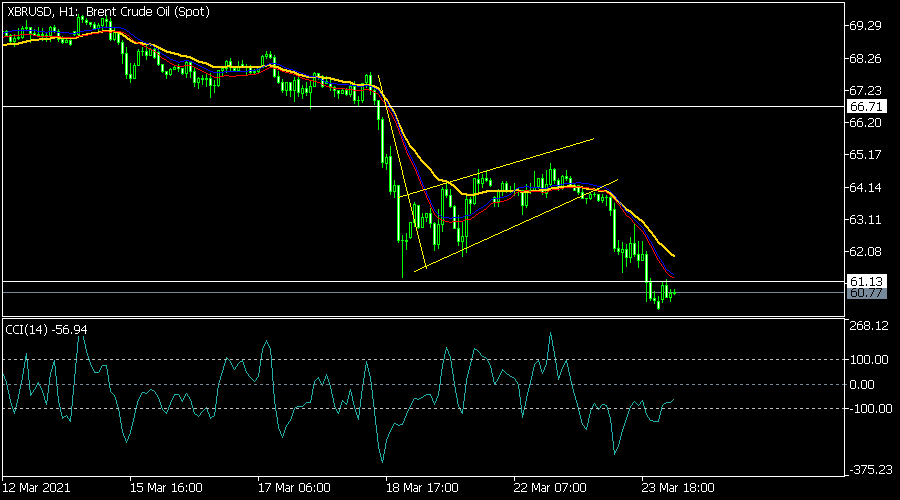 The XBR/USD pair declined to an intraday low of 60.25 in the overnight session. On the four-hour chart, the pair remains below the moving averages and the envelopes indicator. The commodities channel index (CCI) has also moved above the oversold level. The pair may keep falling as bears attempt to move below the support at 60.00.