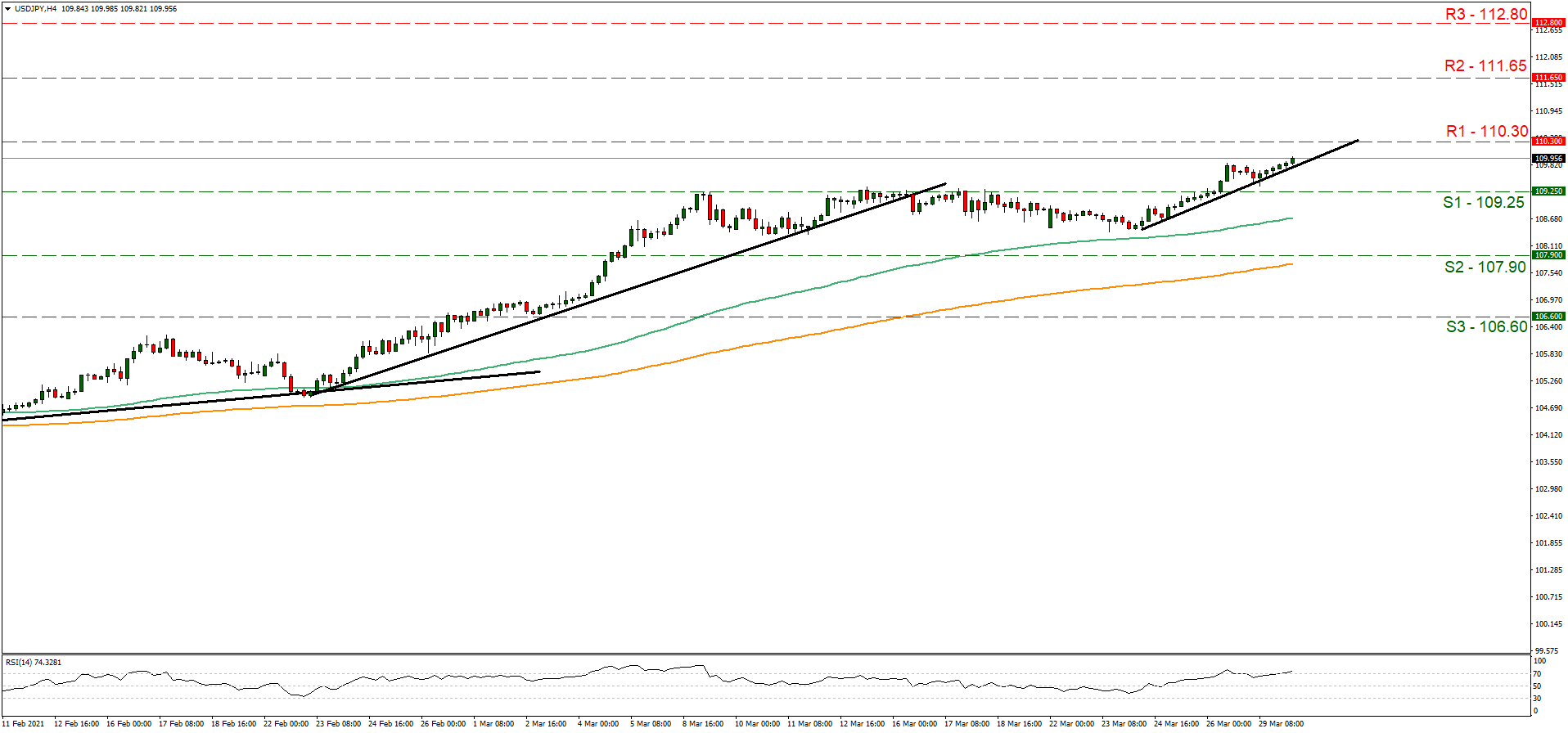 USD/JPY rose yesterday aiming for the 110.30 (R1) resistance line. We tend to maintain a bullish outlook for the pair as long as it continues to be guided by the upward trendline incepted since the 24th of March. Please note though that the RSI indicator below our 4-hour chart has surpassed the reading of 70 maybe implying that the pair is overbought, and a correction lower is possible. Should the pair continue to find fresh buying orders along its path we may see it breaking the 110.30 (R1) resistance line and aim for the 111.65 (R2) resistance barrier. Should a correction lower come into play and a selling interest be displayed by the market, we may see USD/JPY breaking the 109.25 (S1) support line and aim for the 107.90 (S2) support hurdle.