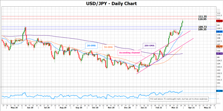 The latest monthly Nonfarm payrolls report will probably show on Good Friday at 12:30 GMT that the relaxation of lockdown restrictions, the drop off in covid cases, and the progress in the vaccination program have enhanced the recovery in the US labor market even without Biden’s latest fiscal boost. While the data may be overstating the continuous employment improvement, it could raise volatility in the dollar during a low liquidity day.