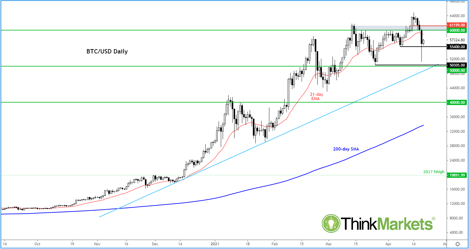 But every single dip has been bought and this may turn out to be another such occasions. The technical bias would only turn decisively bearish when prices create a major lower low. The last low comes in at around $50300, where we also have a bullish trend line converging. So, a potential move below that level would be deemed a bearish technical breakthrough.