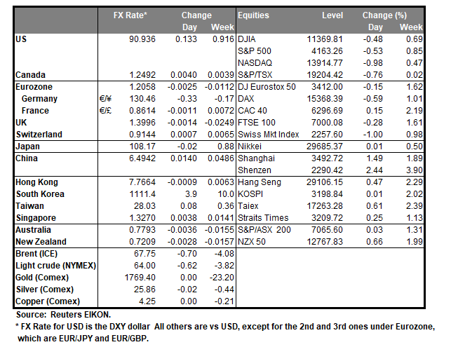 Yesterday the dollar retreated to lows last seen six weeks ago, practically at the beginning of April, against a basket of its counterparts. It should be noted that commodity currencies were supported by a positive market sentiment, while the common currency got substantial support on news improving its vaccination program. It should be noted that the USD had allready been losing traction, given that it has relented ground over the past two consecutive weeks. Analysts tend to note that gains made in first three month of the year are being reversed also due to the fact that US yields remain soft, despite a small rise yesterday in the 10 year US Treasury yield. We expect that fundamentals are to continue to direct market sentiment given also that there is a lack of high impact financial releases from the US today and should market optimism continue to guide it, we may see the USD retreating further.