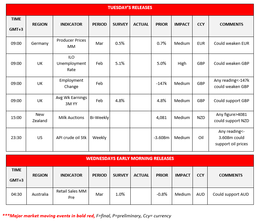Today during the European session, we get Germany producer prices growth rate for March, UK’s employment data for February as noted earlier, New Zealand’s Milk Auctions figures and just before Wednesday’s Asian session starts we get from the US the API weekly crude oil inventories figure for last week. During tomorrow’s Asian session we note Australia’s preliminary retail sales for March.