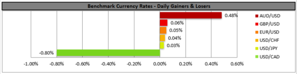 The Loonie tended to rally against the USD yesterday, as despite BoC remaining on hold as expected, the bank decided to adopt a hawkish tilted tone, expressing considerable confidence and tapered its bond purchasing program. On the other hand, the FX market was rather quiet, with the USD retreating somewhat, as US yields tended to remain on the soft side. Gold prices on the other hand benefited from weaker USD, while US stockmarkets were also on the rise as a more risk on approach was present. Oil prices continue to weaken given that US oil inventories were building up, while at the same time the demand outlook seems to be shaky. We may see traders today focusing on the US data, yet we also expect fundamentals to continue to affect USD’s direction. Should the fundamentals allow for a more risk on approach, we may see the USD weakening further and vice versa.